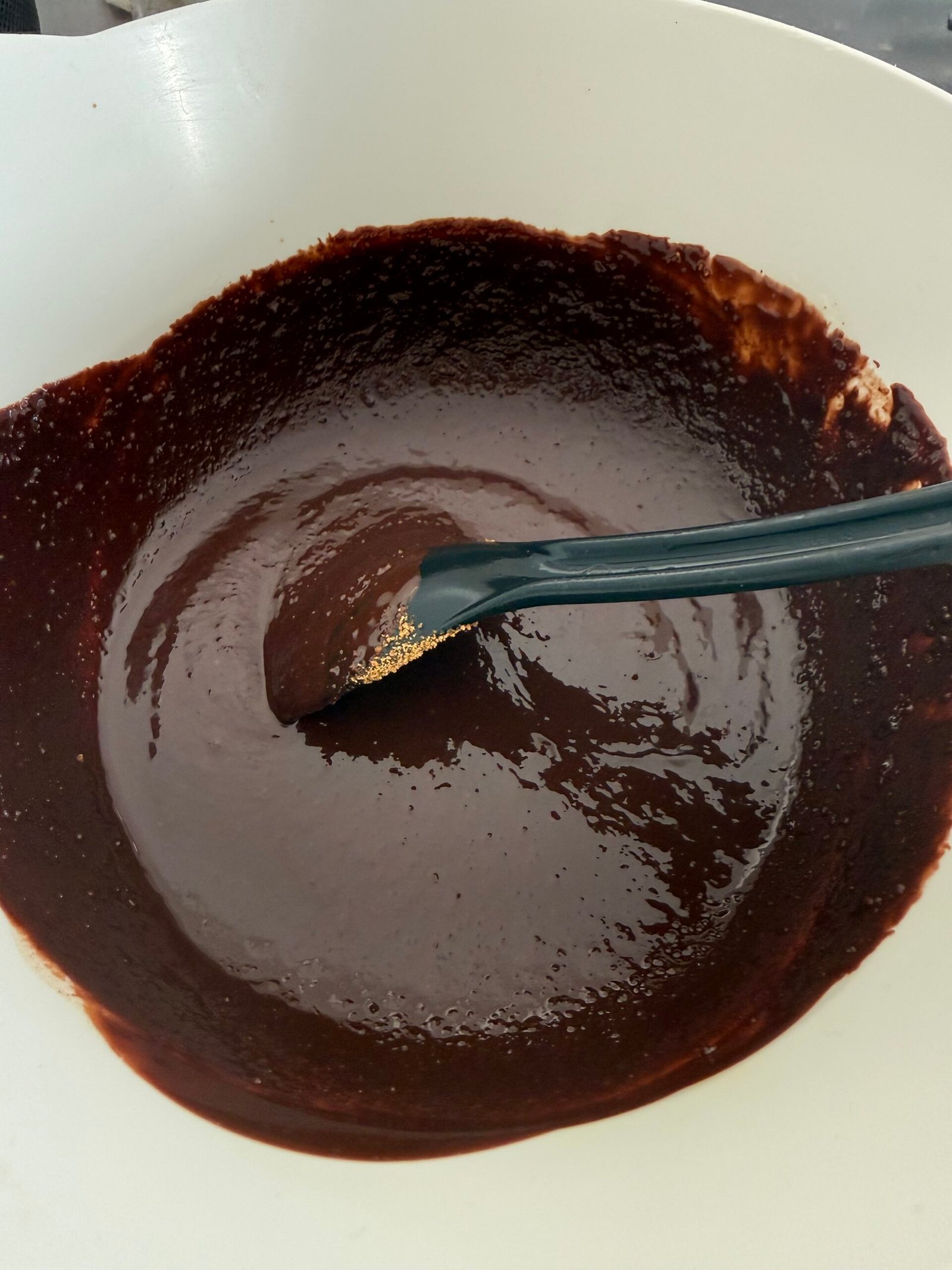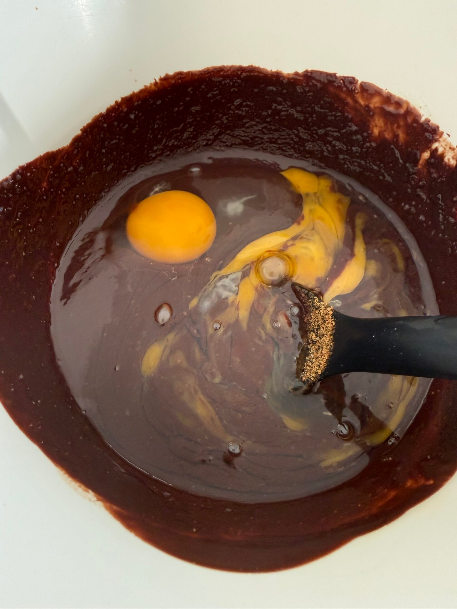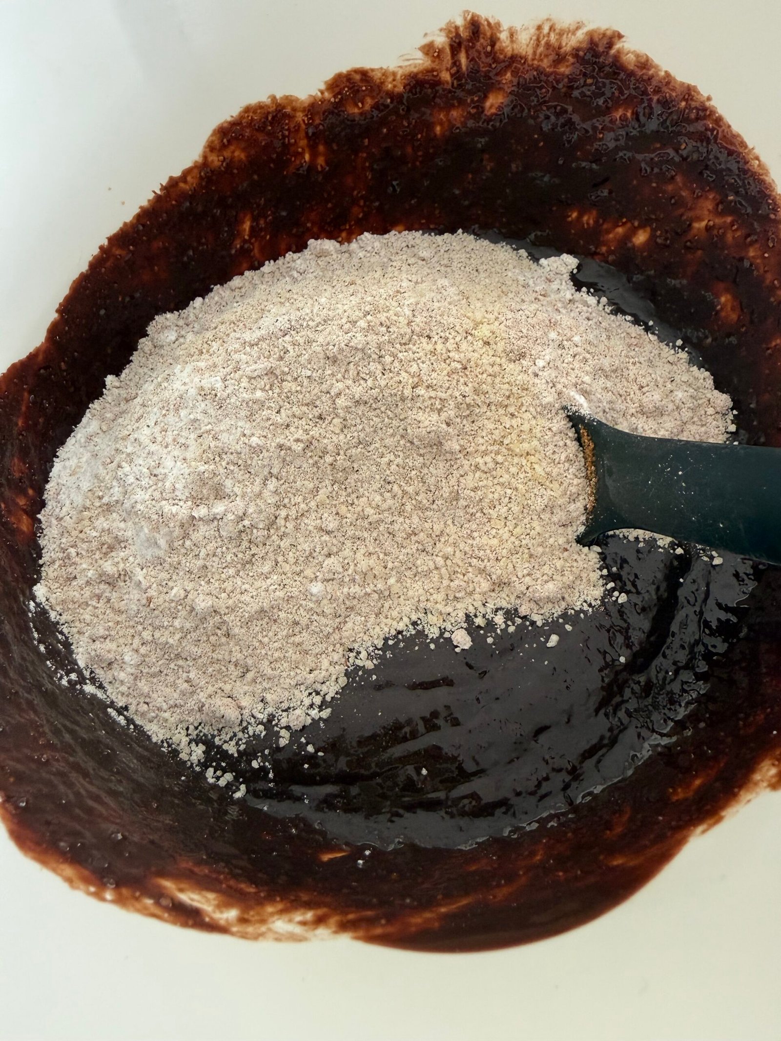 Pour the flours into the chocolate base, stir without overworking.
