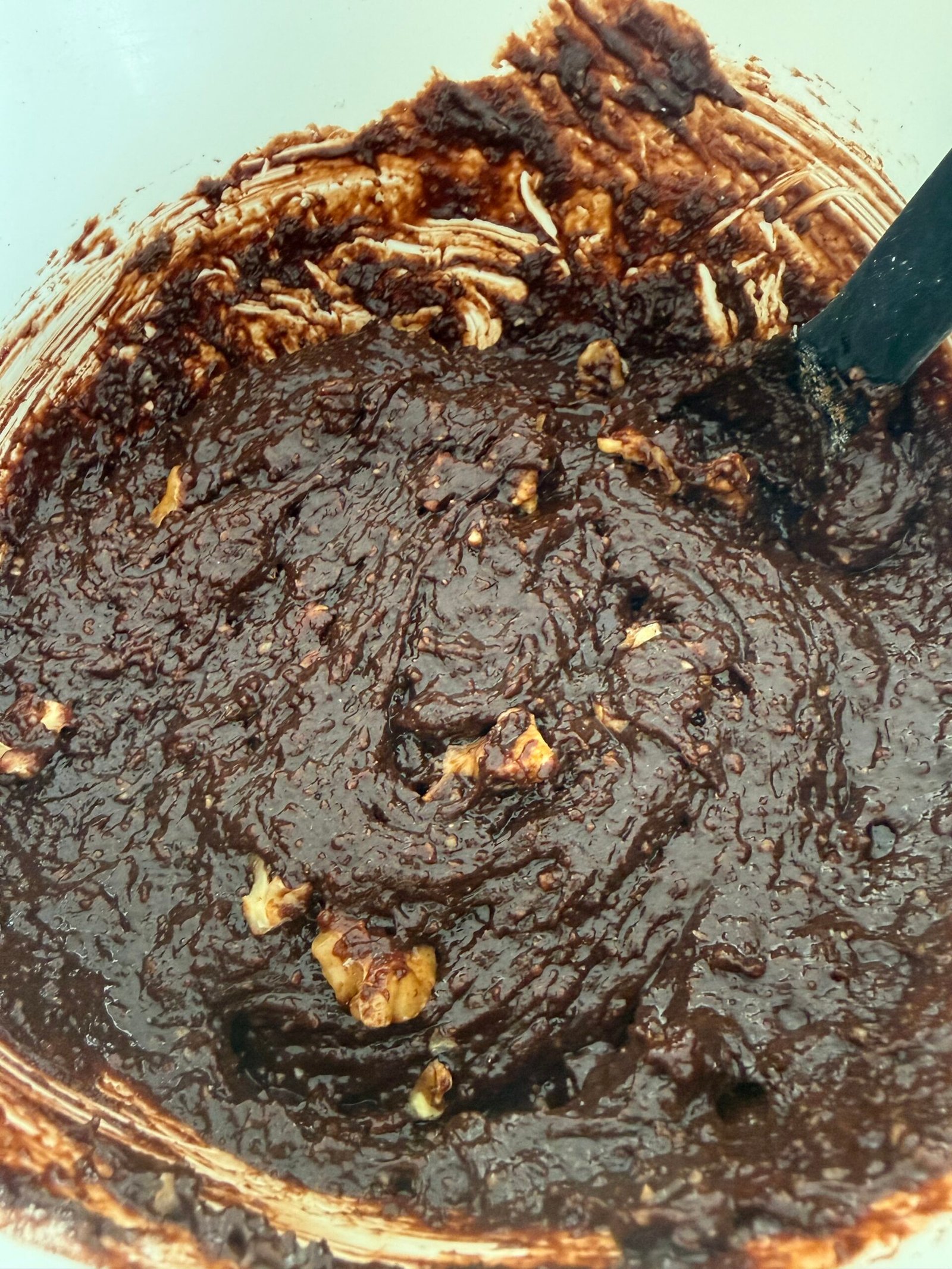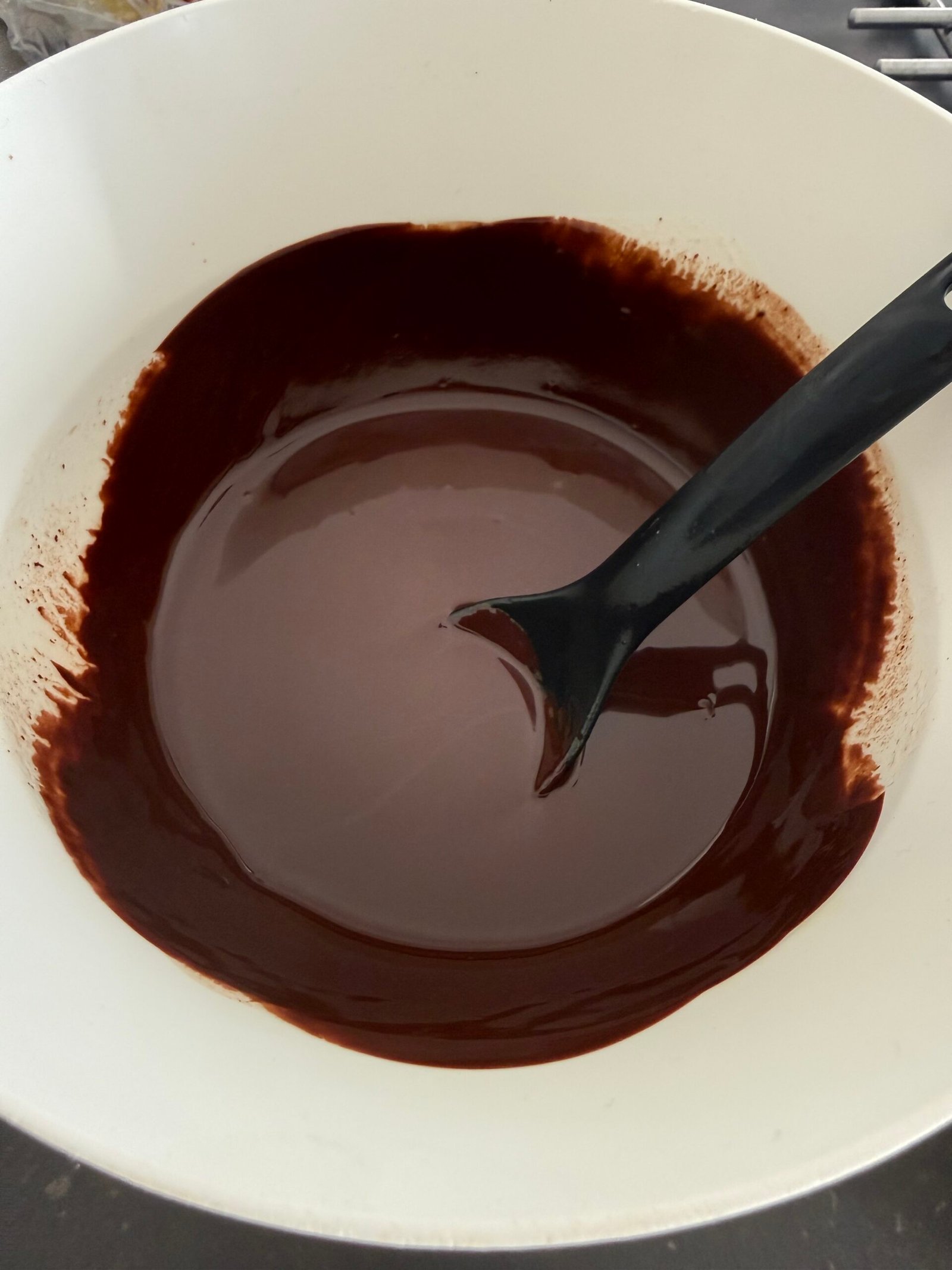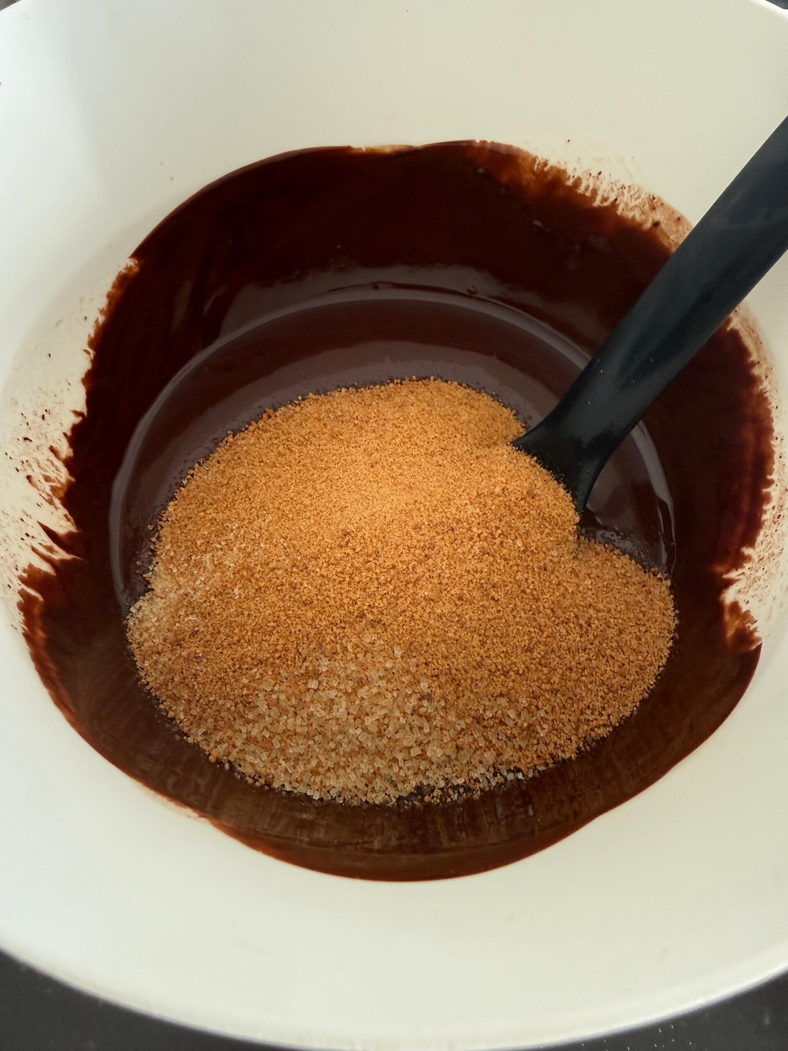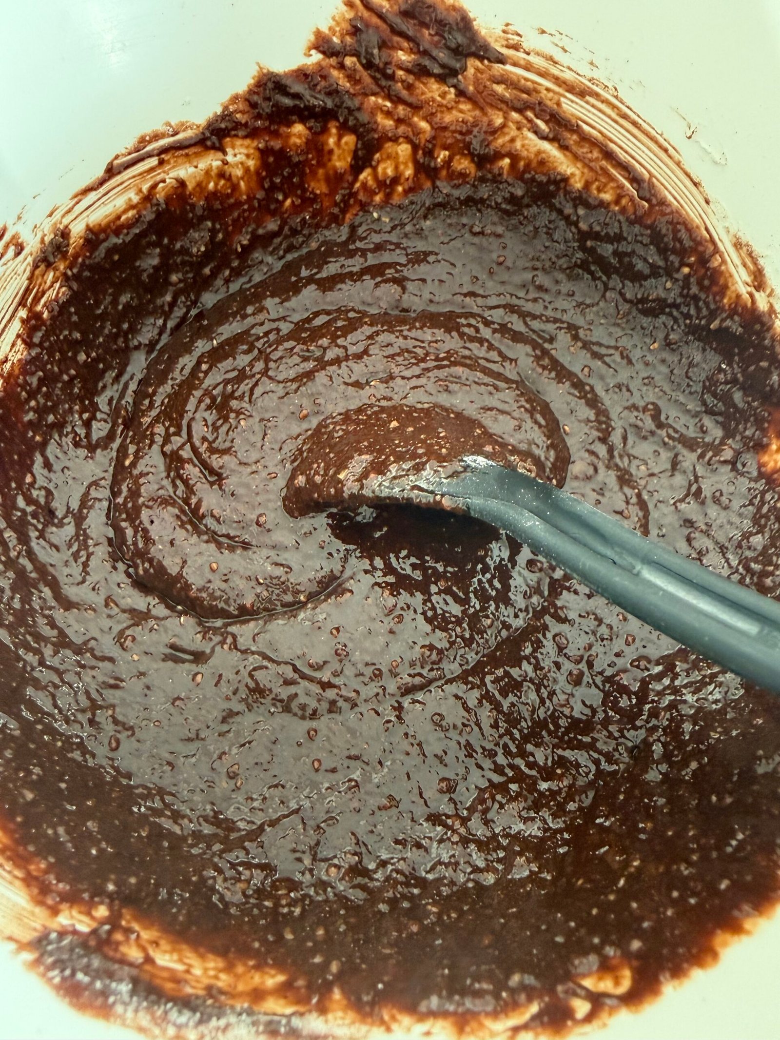 Pour the flours into the chocolate base, stir without overworking.