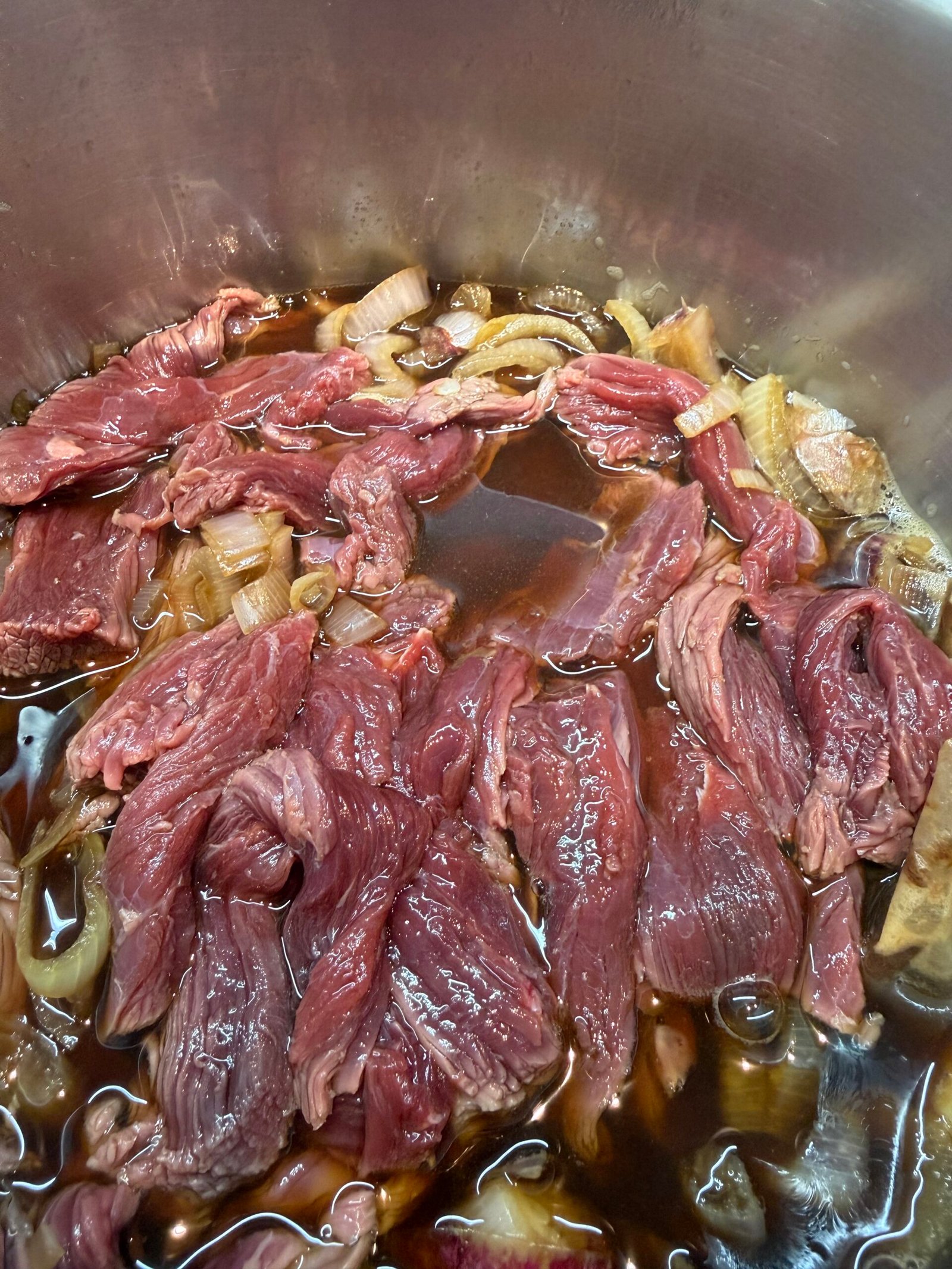 Add the beef slices and let them cook for a few minutes, just until they lose their pink color.