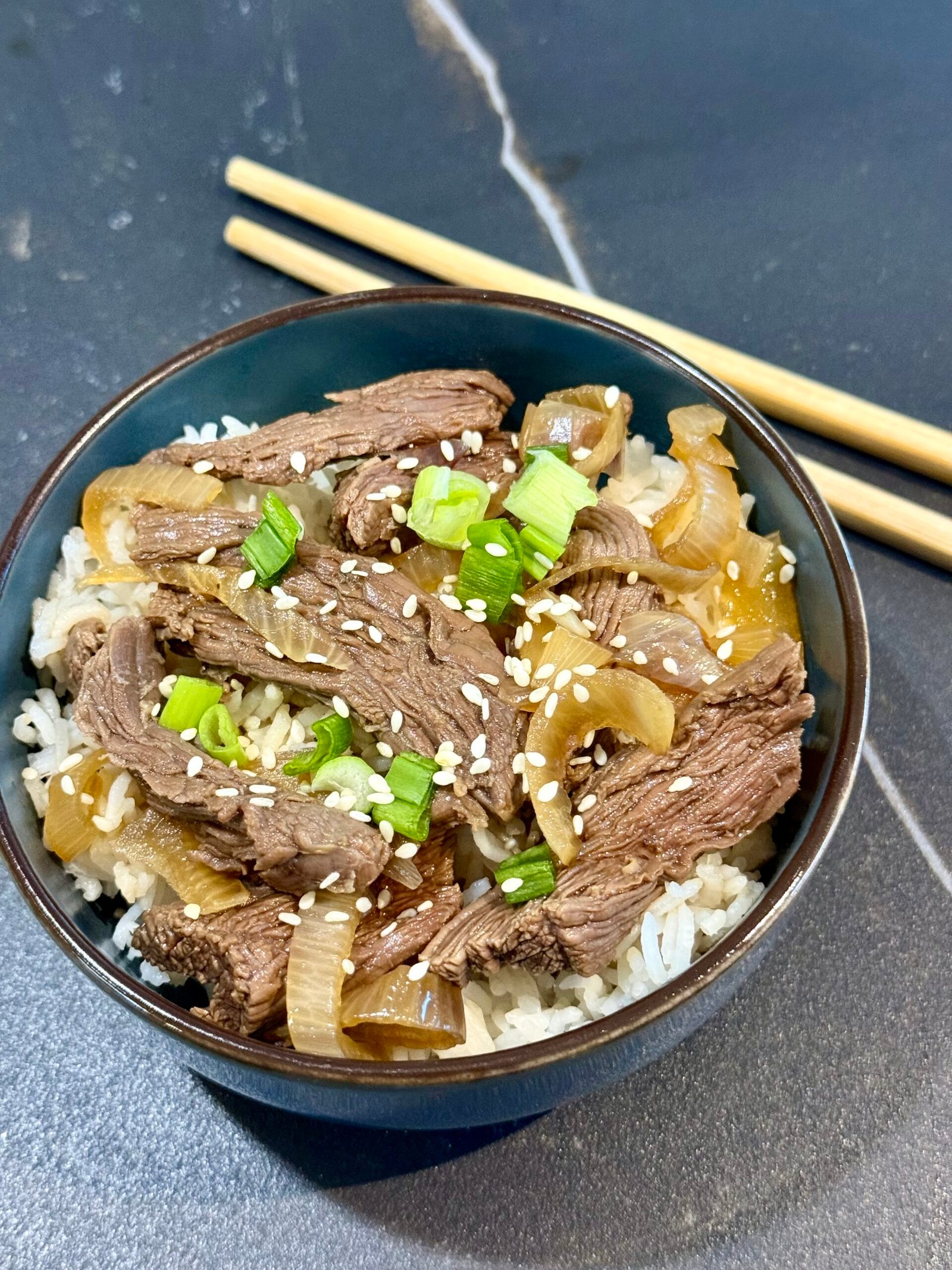Gyudon a popular dish served in restaurants all over Japan. This bowl of rice topped with thin strips of beef simmered in a sweet and savory sauce is both simple and delicious. To make it gluten-free, simply use tamari sauce or gluten-free soy sauce. The meat is tender thanks to gentle cooking with fragrant onions. This dish is quick to prepare, making it an ideal recipe for a weeknight meal. The trickiest part is finding dashi broth, but you can substitute a light fish stock instead. If you really want to get the Japanese touch, add a soft-boiled egg on top. Sprinkle with a few green onions and sesame seeds, and you have a Japanese dish that's easy to prepare, beautiful, and delicious!