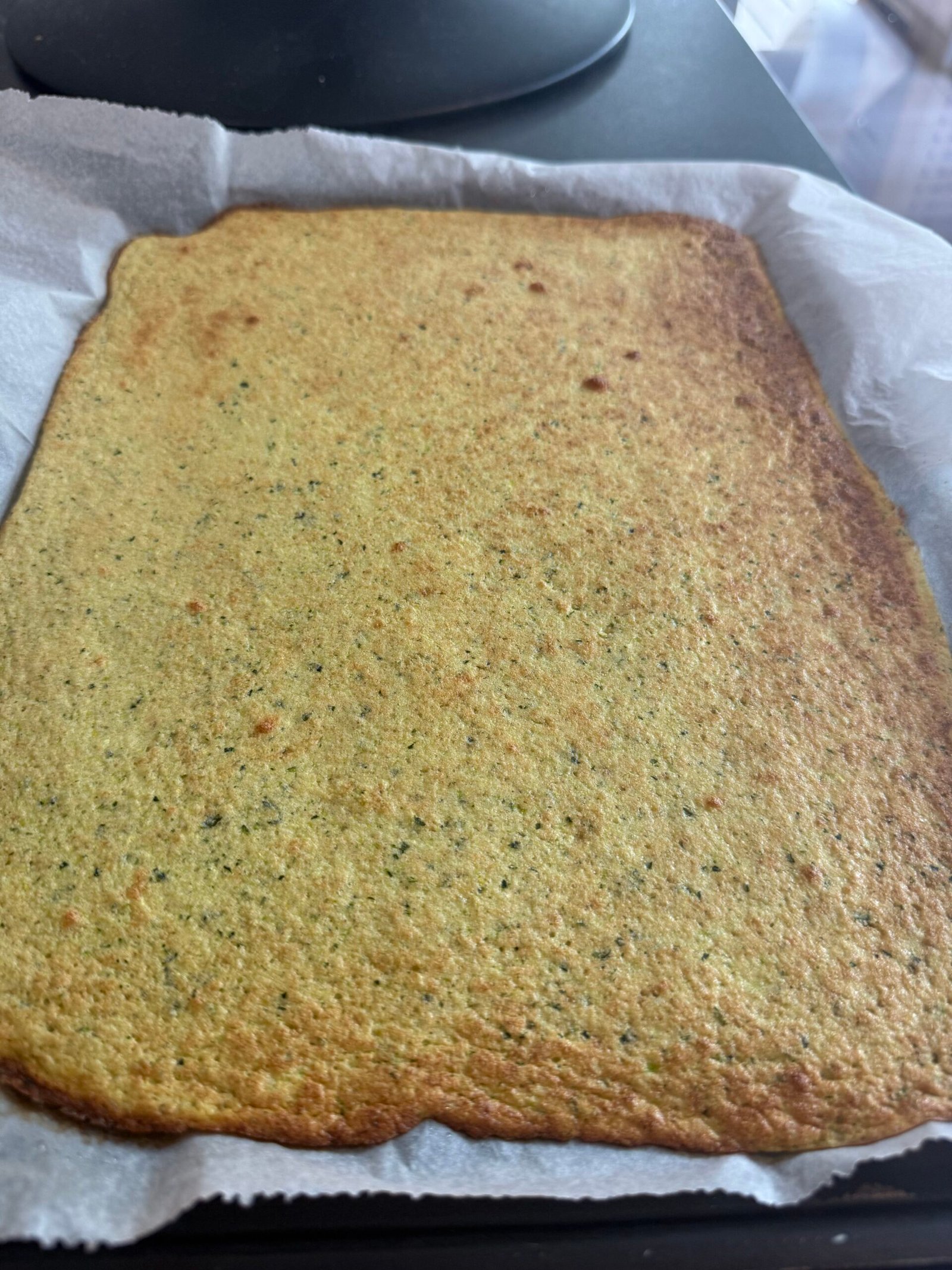 Bake for about fifteen minutes; the base should remain soft and golden. Then turn the sponge cake out onto a tea towel and wrap it in the sponge to set.