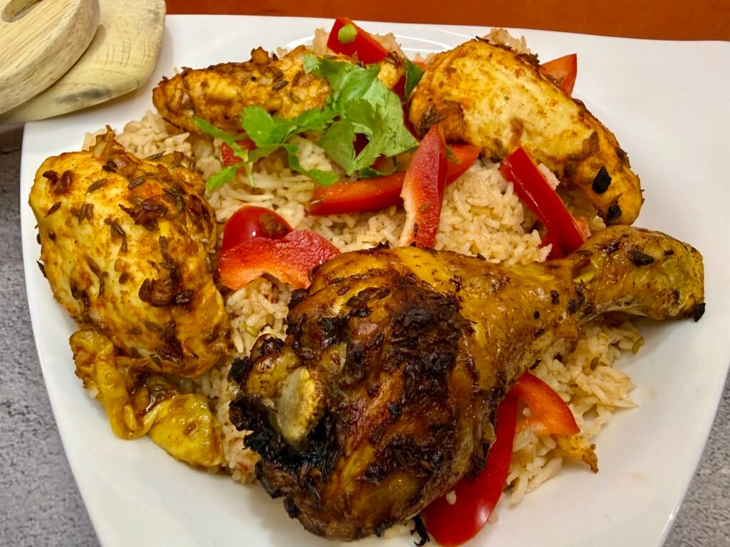 El Bariis Iskukaris Mashiwi es uno de los platos más populares de Somalia. Se trata de arroz aromático con especias locales y pollo marinado y asado. Este plato se inspira en las antiguas rutas comerciales marítimas entre el Océano Índico, Arabia y África Oriental. El arroz se cocina en un caldo con clavo, cardamomo y comino, típico de la cocina somalí. El pollo se marina antes de asarlo, pero también se puede hornear. El Bariis suele teñirse con azúcar caramelizado, lo que le da un característico tono ámbar, pero yo no lo hice: ¡tú eliges! Este plato se suele preparar para reuniones familiares, celebraciones religiosas y bodas. El arroz es un alimento básico en la cultura somalí, junto con la leche de camella y las especias. Es un plato completo, aromático y sin gluten.