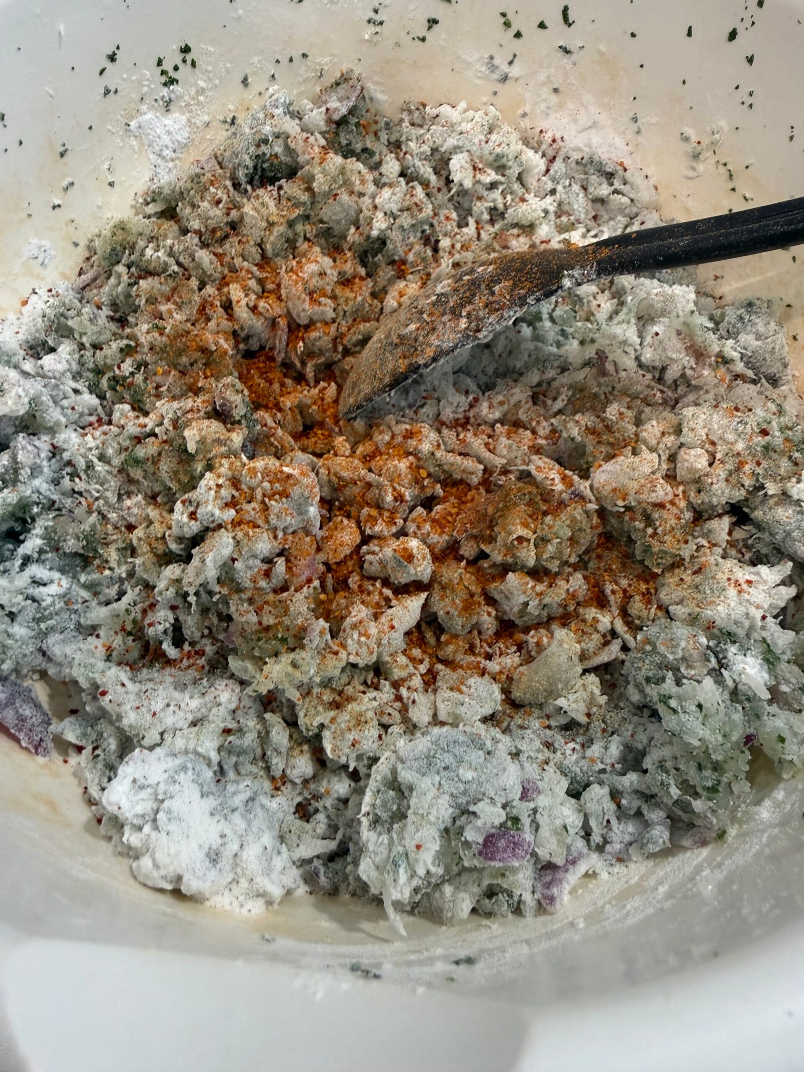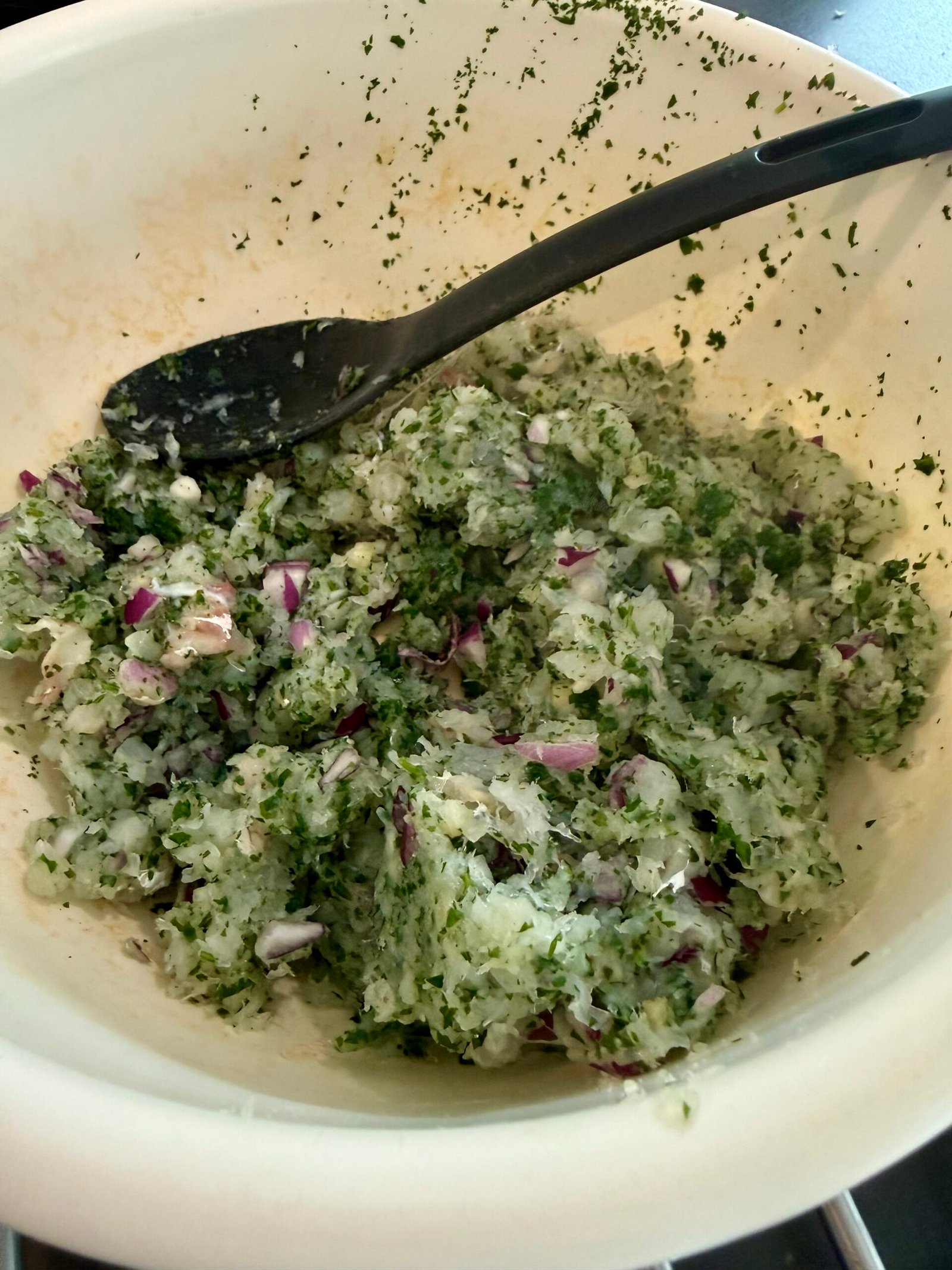 2. Mélangez le cabillaud émietté, l’oignon, l’ail et le persil dans un saladier.