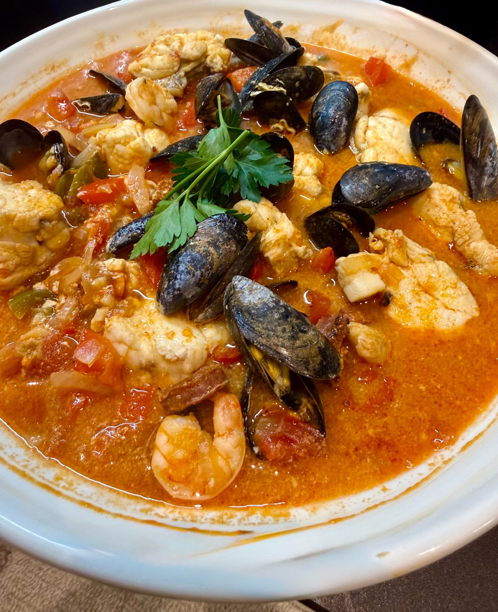 Véritable icône de la cuisine portugaise, la cataplana est à la fois le nom du plat et celui de l’ustensile (cette sorte de “cloche” hermétique). Sa cuisson à l’étouffée préserve toutes les saveurs et les nutriments. Bonne nouvelle pour les gourmets attentifs : ce plat est naturellement sans gluten (faites juste attention au chorizo) ! C’est le plat convivial par excellence, sain et coloré, qui a réellement enchanté tous mes invités la semaine dernière. Et rassurez-vous, même si vous n’avez pas de cataplana en cuivre, ce qui est mon cas, vous pouvez réaliser la recette dans un grand wok avec couvercle, une cocotte en fonte ou une grande sauteuse, le résultat sera tout aussi bon.