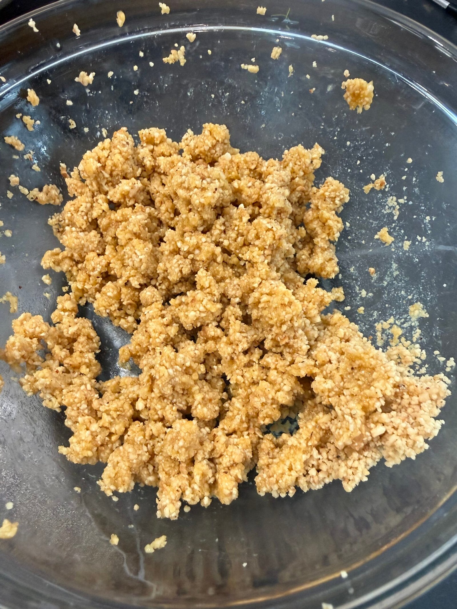 Versez le caramel sur l'appareil aux noisettes et mélanger bien.