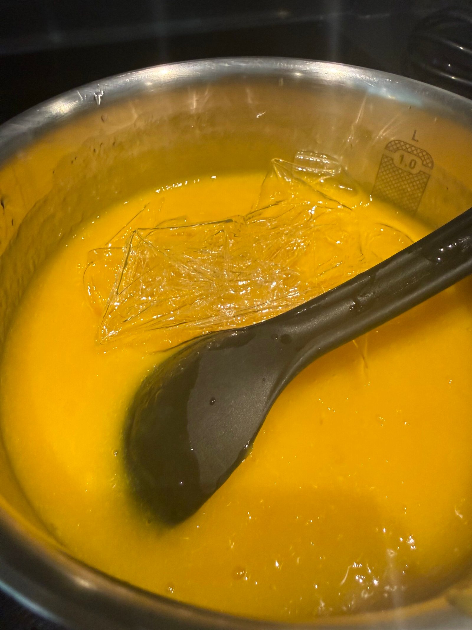Chauffer la purée mangue/passion, puis ajouter le mélange pectine/sucre. Amener à ébullition tout en continuant à mélanger pendant environ 30 secondes.