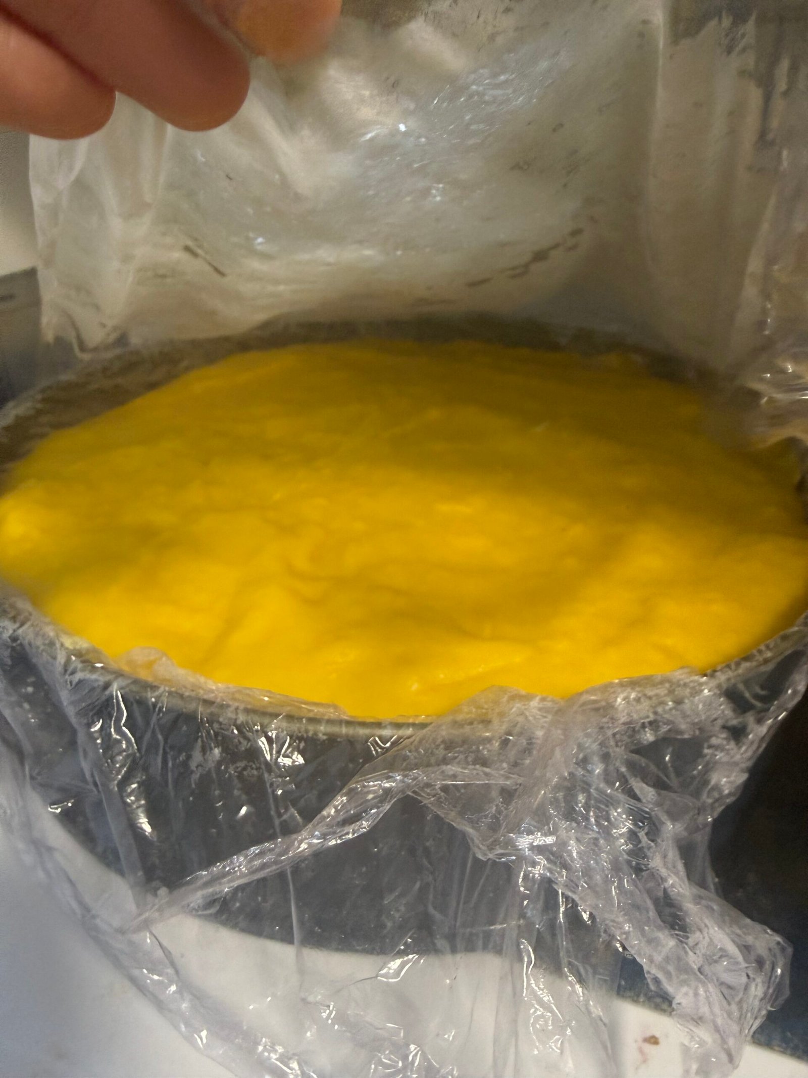 J'ai utilisé un moule à manquer (comme pour faire le cheesecake) que j'ai filmé avec du film alimentaire. Sinon vous pouvez utiliser votre cercle à pâtisserie, avec du film alimentaire sur le fond pour tenir l'entremet et un ruban de rodhoid sur les côtés. Placez dessous votre dacquoise, versez 2/3 de la mousse de mangue, posez l'insert mangue/passion en appuyant un peu et recouvrez du reste de mousse de mangue.