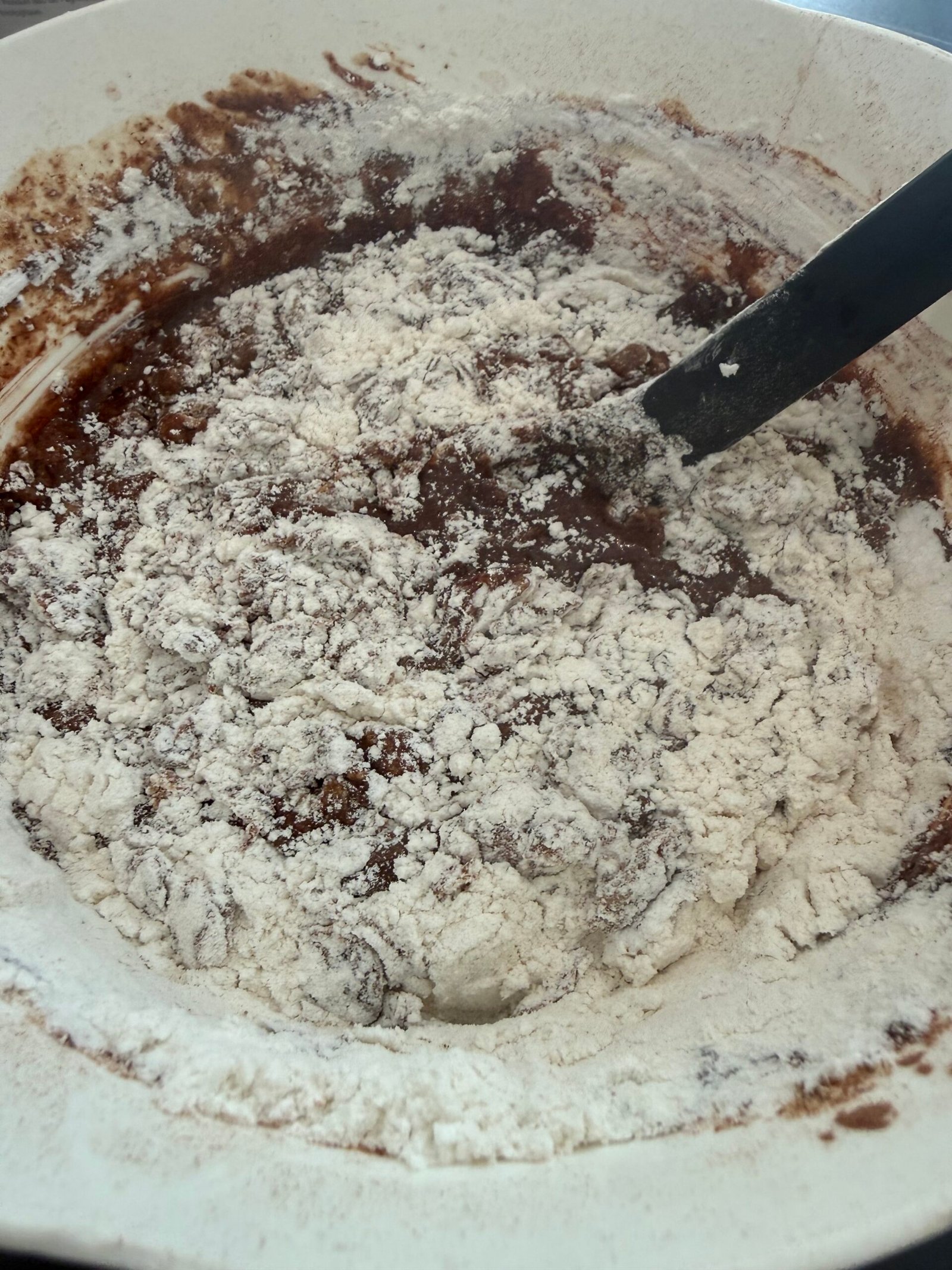 4. Ajoutez les farines, la levure et le bicarbonate. Mélangez bien.