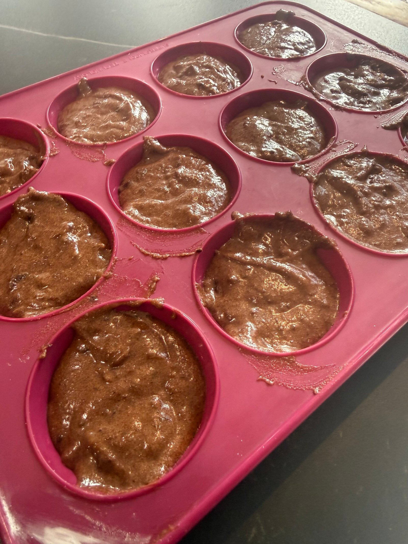 5. Mettre à raz bord dans des moules à muffins; j'utilise un moule en silicone de 12 empreintes de taille normale.