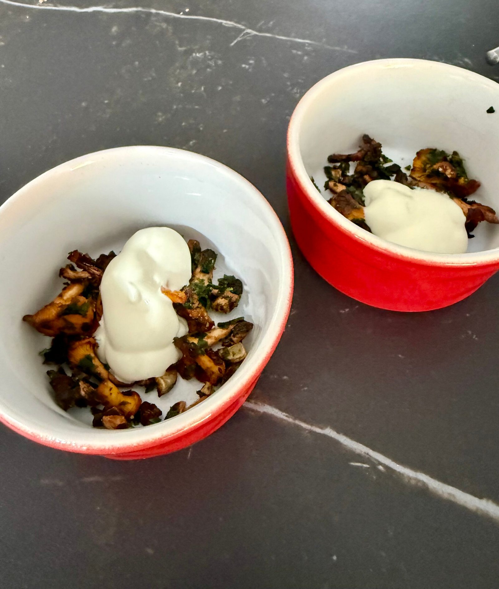 Répartissez les girolles sautées dans deux ramequins adaptés au micro-ondes.