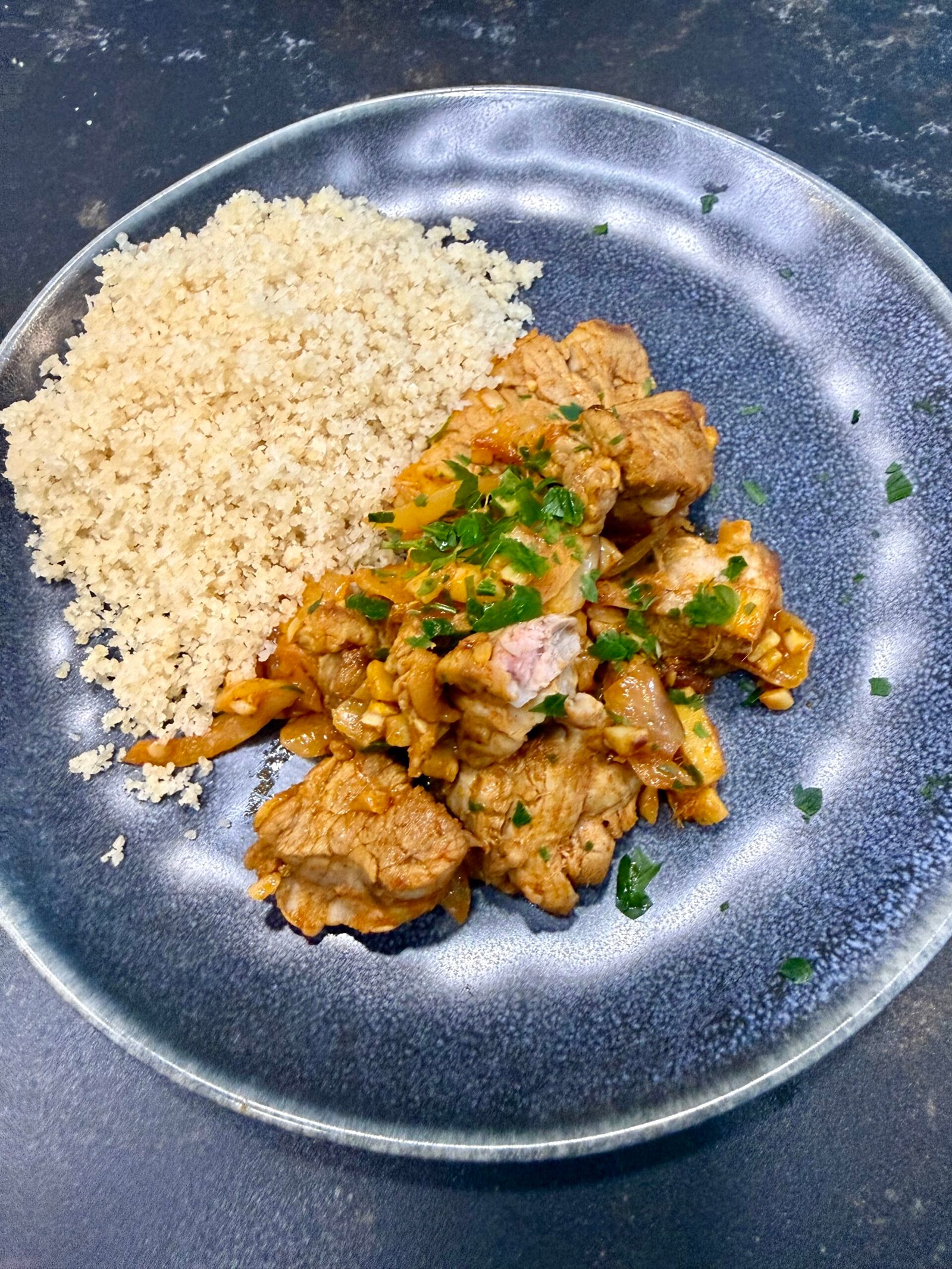 Le porc braisé ivoirien est un plat traditionnel du Sud de la Côte d’Ivoire. Les maquis (restaurants) le servent avec de l’attiéké ou des bananes plantains. La viande cuit lentement sur le feu et prend une saveur fumée caractéristique mais il est tout à fait possible de le cuisiner à la maison, au barbecue ou à la poêle; le résultat et le goût seront tout de même un peu différents. Les épices simples relèvent le porc sans le couvrir. Le gingembre, l’ail et le piment donnent un goût très apprécié. Le citron apporte une note fraîche en fin de cuisson. Le porc reste très tendre grâce à la marinade. Ce plat vous plaira si vous aimez les grillades parfumées. Et cerise sur le gâteau, c’est une recette naturellement sans gluten.