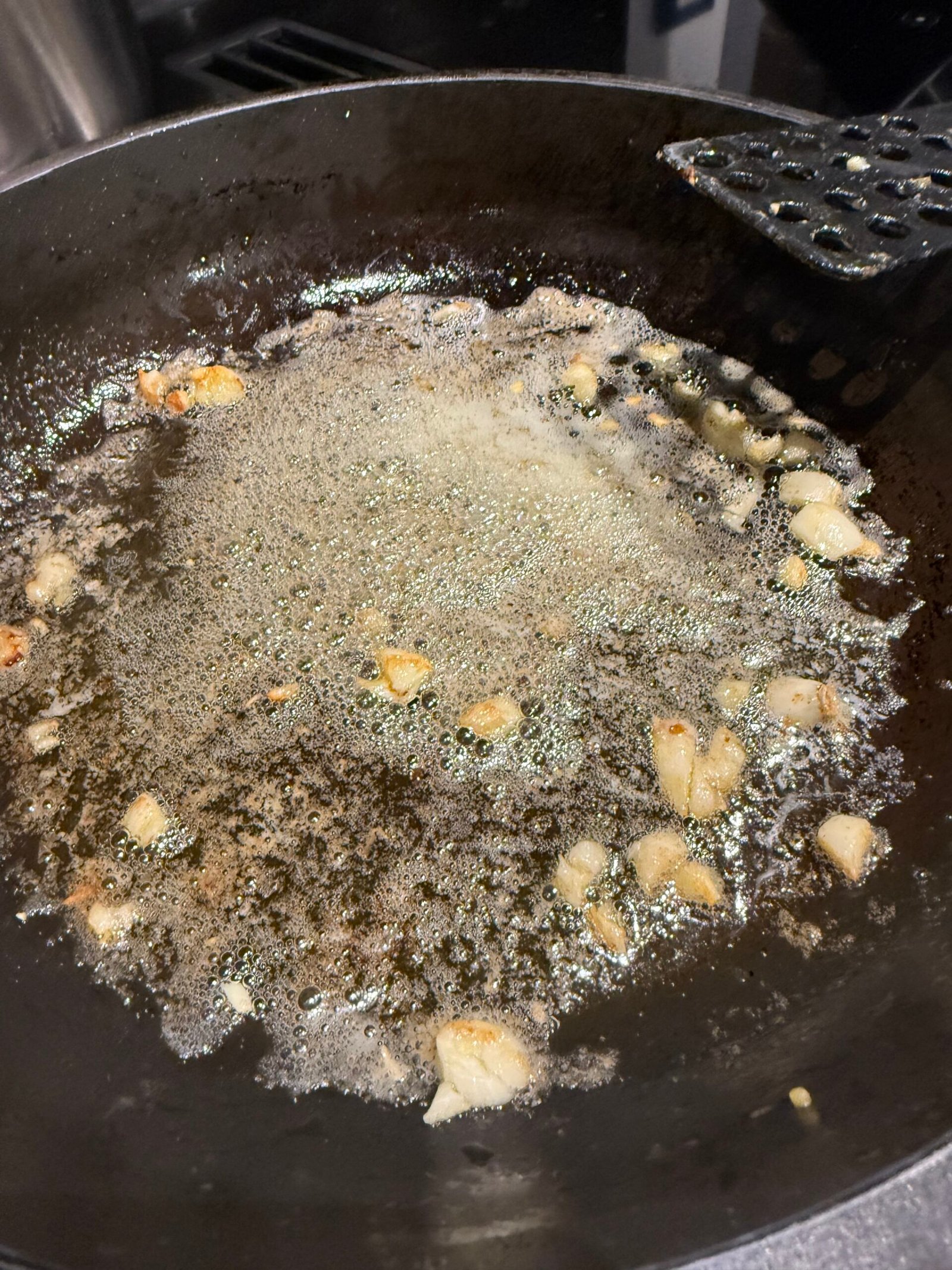 Faire fondre le beurre dans la même poêle, ajouter l’ail et cuire 1 minute à feu doux.