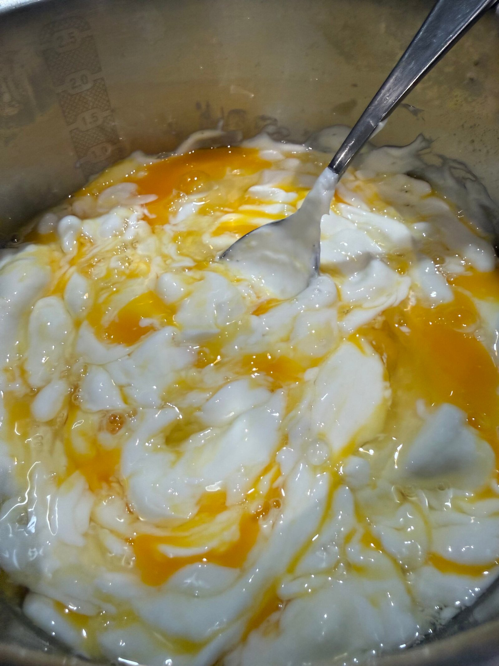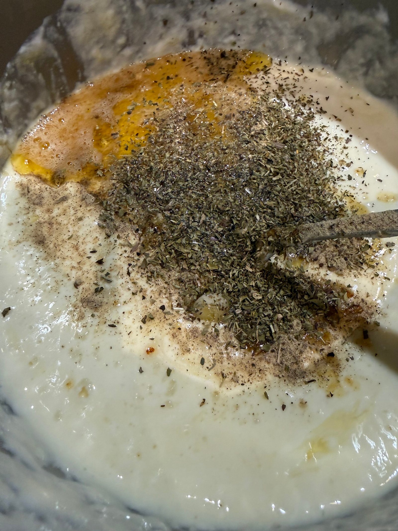 Dans un saladier, fouetter le yaourt avec les œufs, le beurre à l’ail et l’origan.