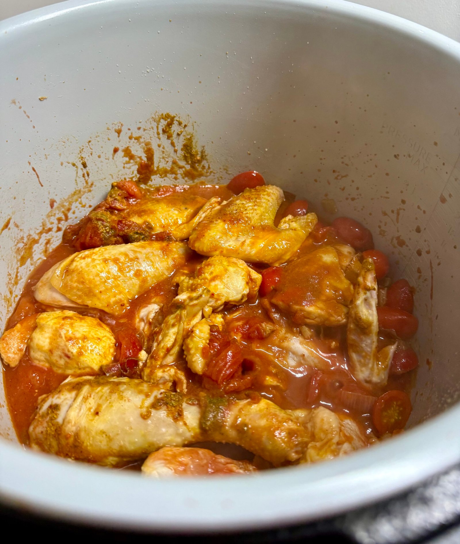Couvrez et laisse mijoter 40 à 45 minutes à feu doux, jusqu’à ce que le poulet soit cuit et la sauce onctueuse.