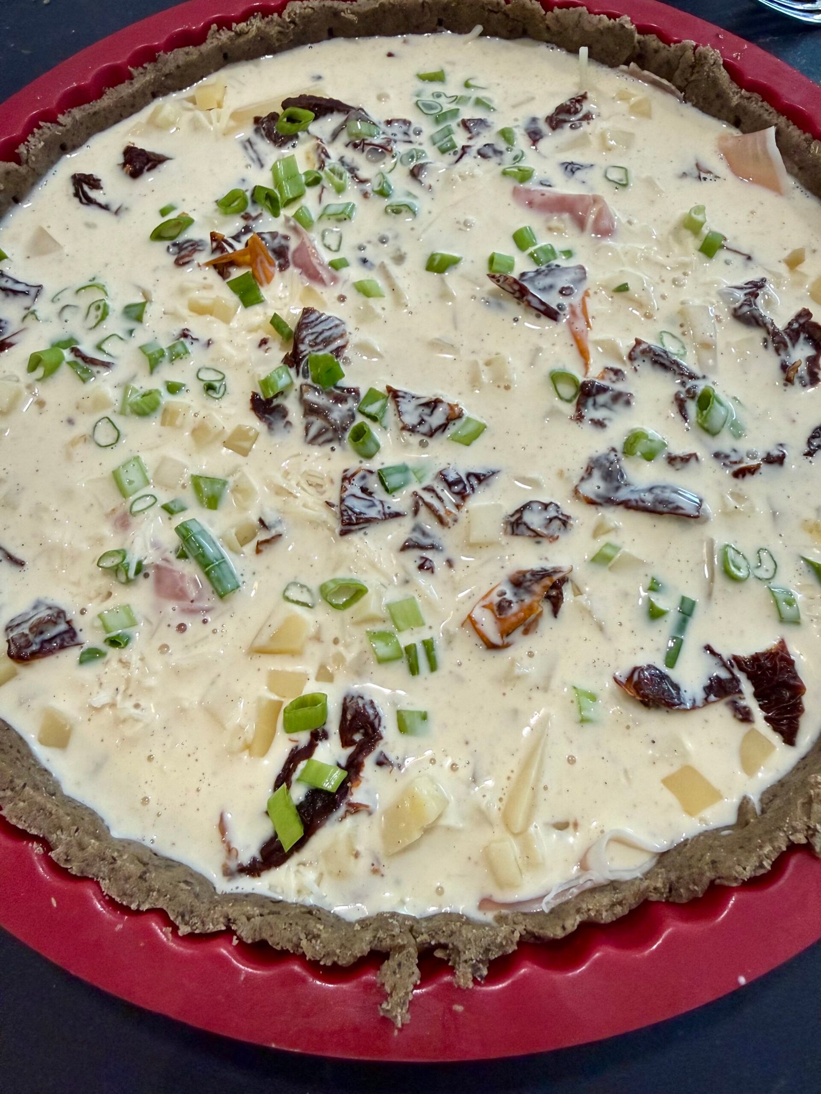 Versez l’appareil à quiche par-dessus et saupoudrez du reste de fromage.