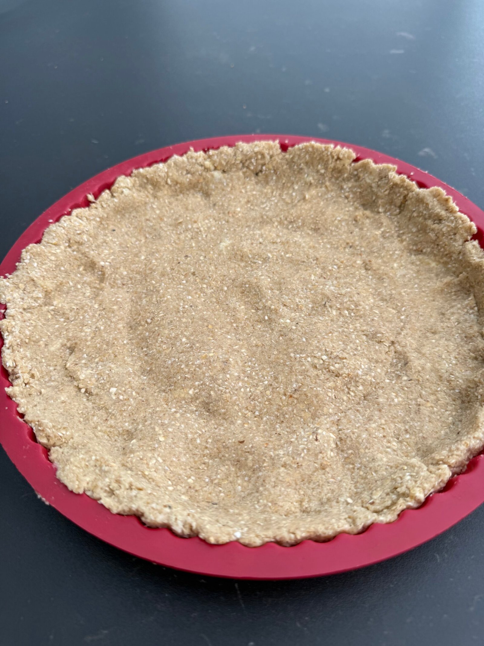 6. Etale la pâte dans un moule à tarte de 30 cm de diamètre. La pâte ne s'étale pas comme une pâte sablée "normale" mais avec les doigts, on y arrive sans problème.