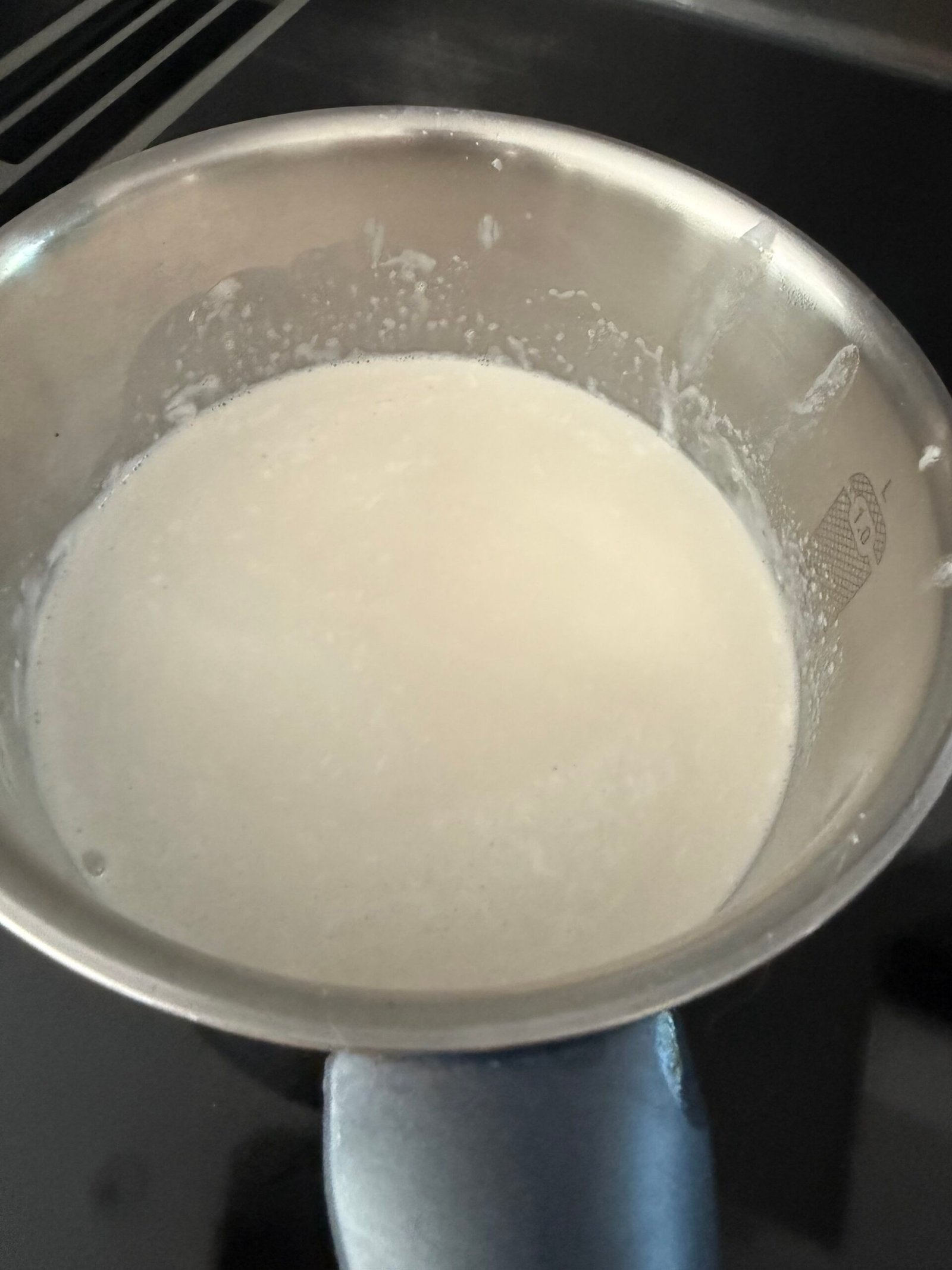 Préparer la sauce au lait de coco : Dans une petite casserole, versez 250 ml de lait de coco avec 3 cuillères à soupe de sucre et le sel. Chauffez à feu moyen, en remuant constamment, jusqu’à ce que le sucre soit complètement dissous. Ne laissez pas le mélange bouillir pour éviter que le lait de coco ne se sépare.