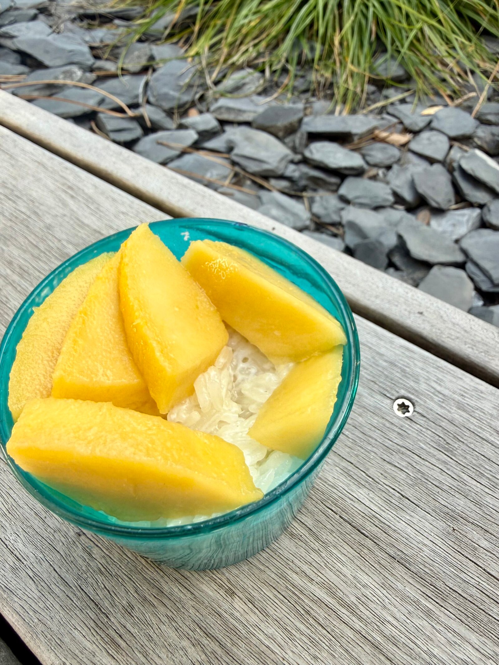 Le Mango Sticky Rice ou “Khao Niew Mamuang” est un dessert que vous trouverez partout en Thaïlande: mes enfants en raffolent (et moi aussi!). Composé de riz gluant parfumé au lait de coco et accompagné de mangue fraîche, ce dessert sans gluten est idéal pour clore un repas sur une note douce et exotique. Facile à préparer, il met en valeur la richesse de la cuisine thaïlandaise. En route pour la Thaïlande !